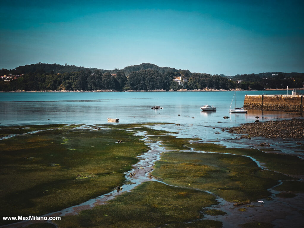 By noon, it was getting hot, so we went back to the refuge of our air-conditioned car to explore the coast. Leaving Miño was dreamlike: green hills, narrow country roads, and views of green-blue bays. After many twists and turns, we arrived in the quasi-medieval town of Pontedeume, with its picturesque marina and a bridge across a narrow channel leading to a pine park on the beach.