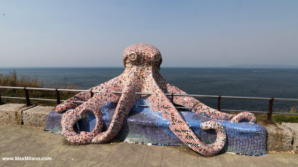 We noticed a huge cargo ship preparing to depart. We wondered how it would navigate the violent swells beyond the harbor mouth as we stood by the giant octopus statue, cute as a Japanese anime monster, seemingly freshly crawled out of the bay to hug the road like one of those radioactive monsters that regularly emerged from Tokyo Bay in the Godzilla movies.