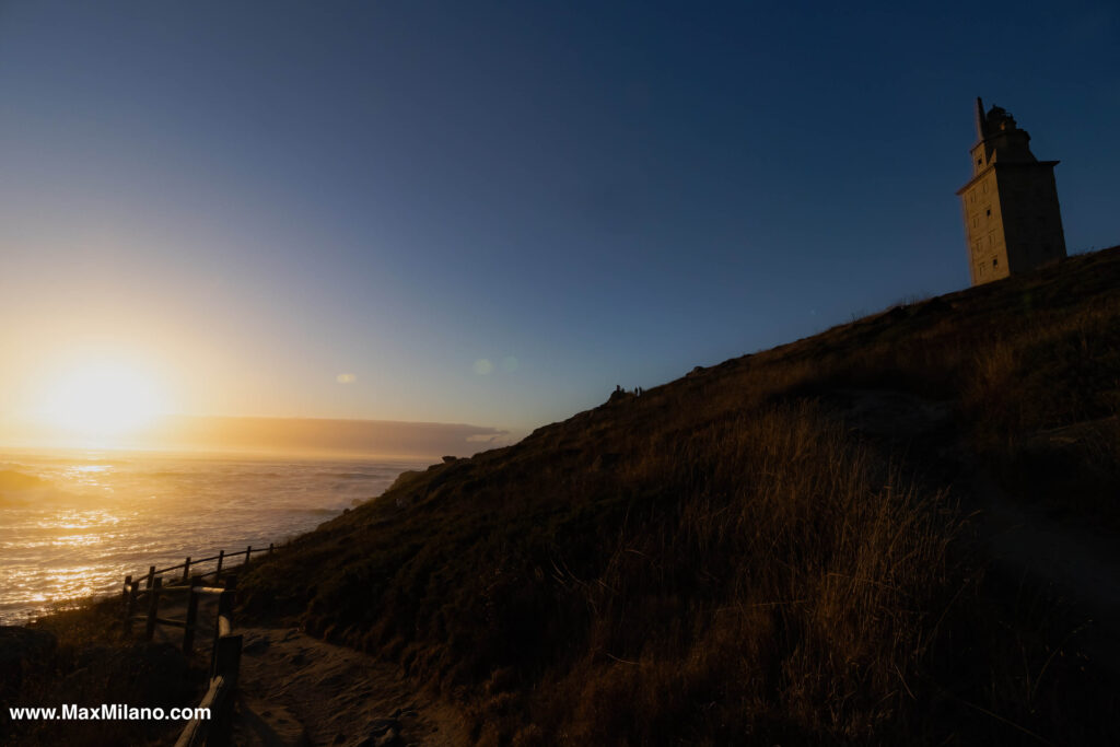 The sun began to set behind the Roman lighthouse, bathing the waves and the mist in gold. It felt good to look west and watch the sun drop into the ocean because it felt like being in California again, only that where we stood, Romans had once kept fires burning atop their lighthouse to keep ships from smashing into the Costa da Morte, the jagged coast of death that guards northern Galicia.