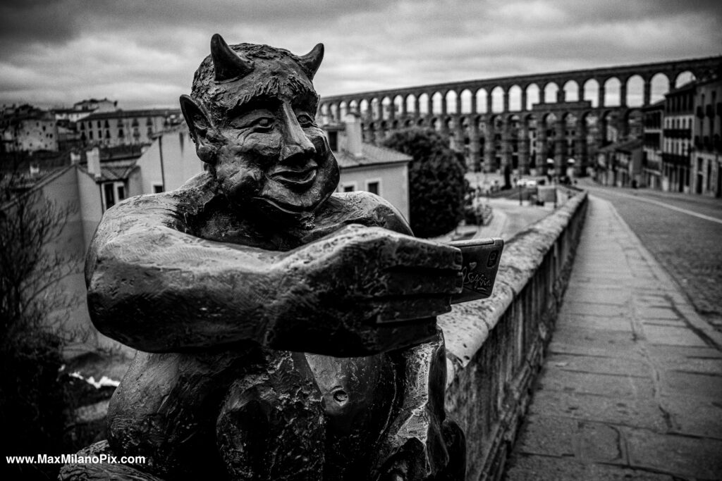 At one end of the aqueduct, where it plunges into the far side of town, someone has installed a bronze statue of the devil taking a selfie. Perhaps the town’s commentary on tourists. We walk beneath the aqueduct’s arches, always impressive, and climb a set of steps to our favorite Segovian café. An old-school bar with red-vested waiters in black ties, where thick hot chocolate and freshly fried churros are always on the menu, served alongside crispy chopped pig skin. When in Segovia, do as the Segovians do.